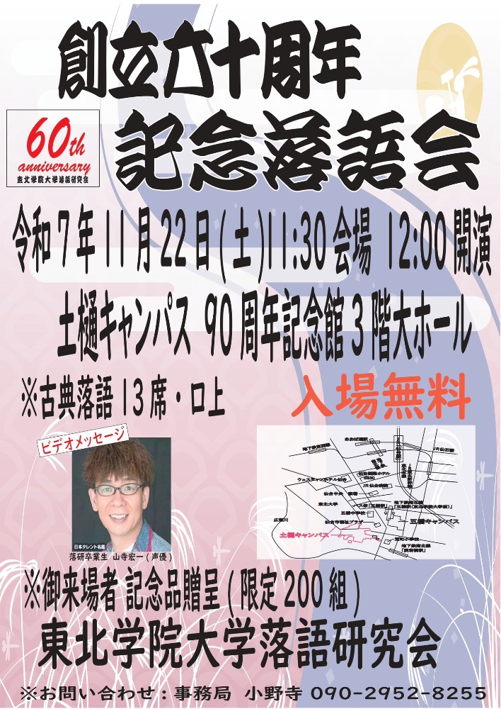 創立60周年を迎える東北学院大学落語研究会の、記念の落語会です。