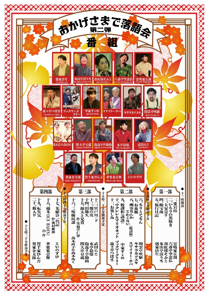 当落研OBである山寺宏一さん(芸名・波慣家文好)からの記念ビデオメッセージ、第21回全国学生落語選手権策伝大賞にて岐阜市長賞受賞の頑張亭たい杜くんも出演予定です。